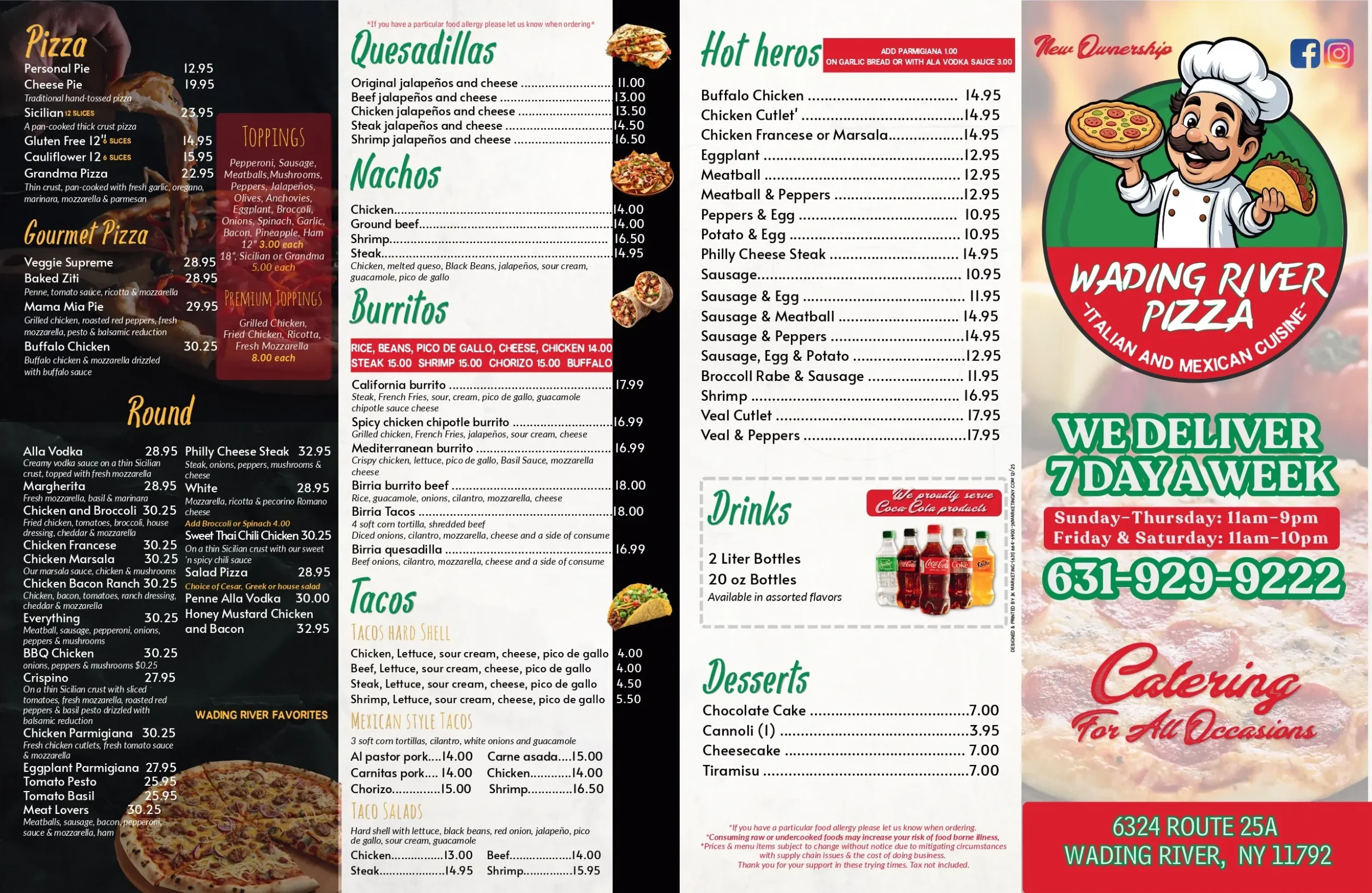 At wading river pizza, we believe the best meals aren’t just cooked; they’re crafted with love. As a family-owned and operated kitchen, we bring the soulful traditions of both Italy and Mexico right to your table. Whether you’re craving a hand-tossed pizza or authentic, flavor-packed tacos, every dish is prepared using only the highest quality, freshest ingredients we can find. From our family to yours, we invite you to experience a menu where heritage meets quality, and every bite feels like home.